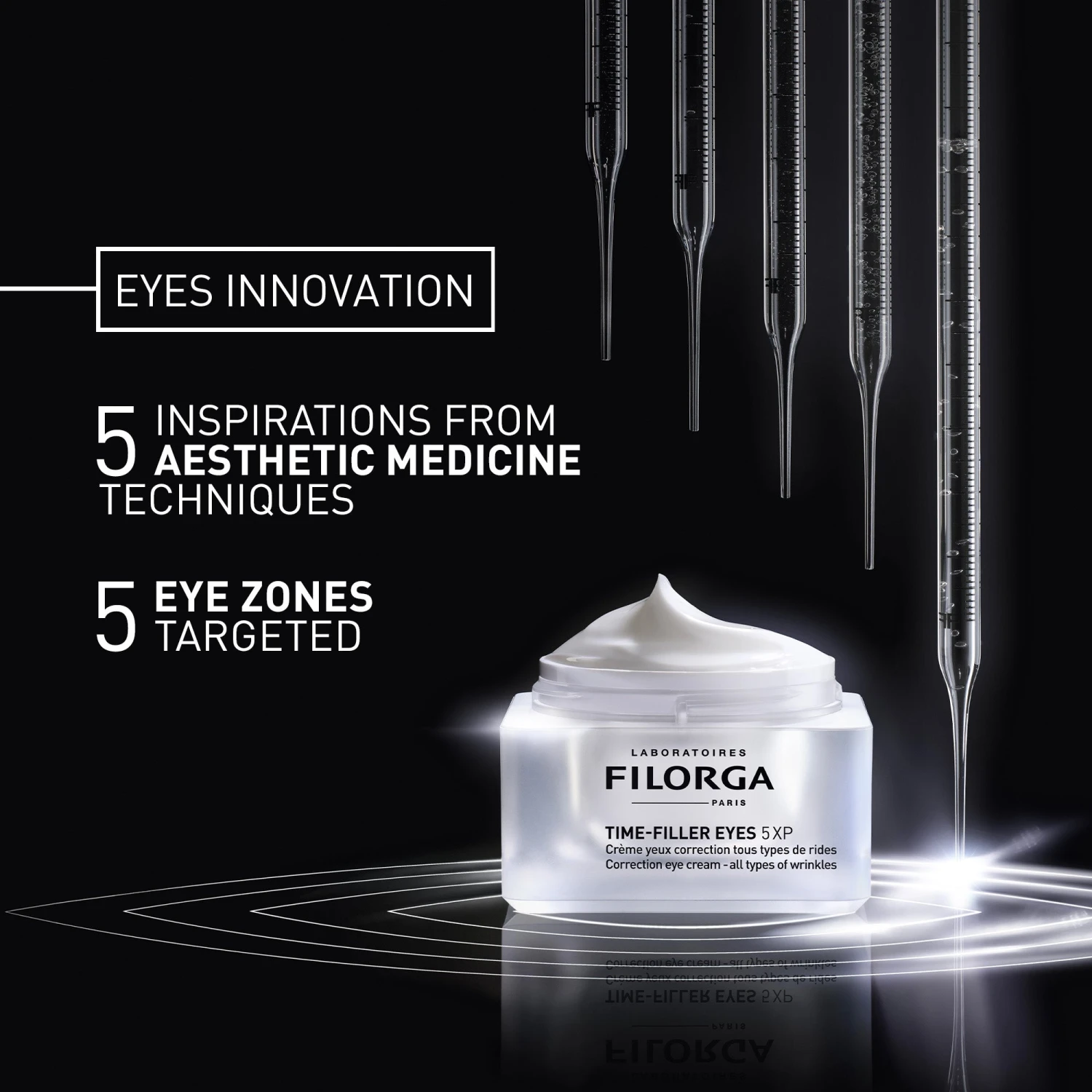 TIME FILLER EYES 5XP is a multi-correction anti-wrinkle cream that simultaneously targets 5 areas around the eyes: crow’s feet, under-eye wrinkles, frown lines, sagging eyelids, and dark circles.