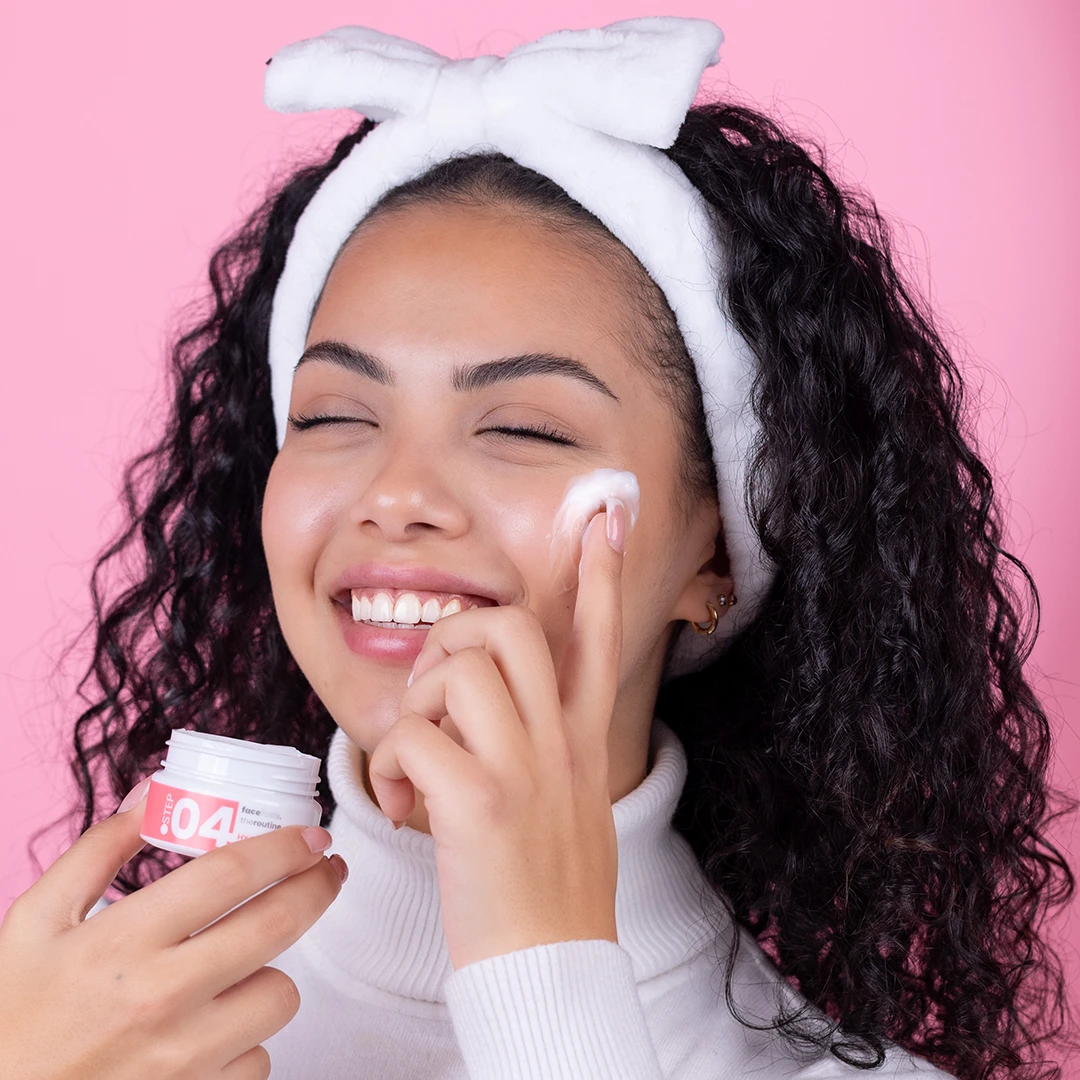 Step 4: Apply moisturizer after your eye cream. Apply a coin-sized amount of the cream to your face, neck and décolletage and gently massage in to your skin. Use AM + PM, as the final step in your routine.