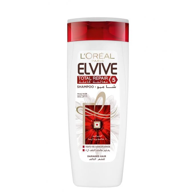 Elvive Total Repair 5 Shampoo is enriched with Pro-Keratin and Ceramide to re-structure and repair the five signs of damaged hair: hair fall, roughness, dullness, flat hair and split ends.