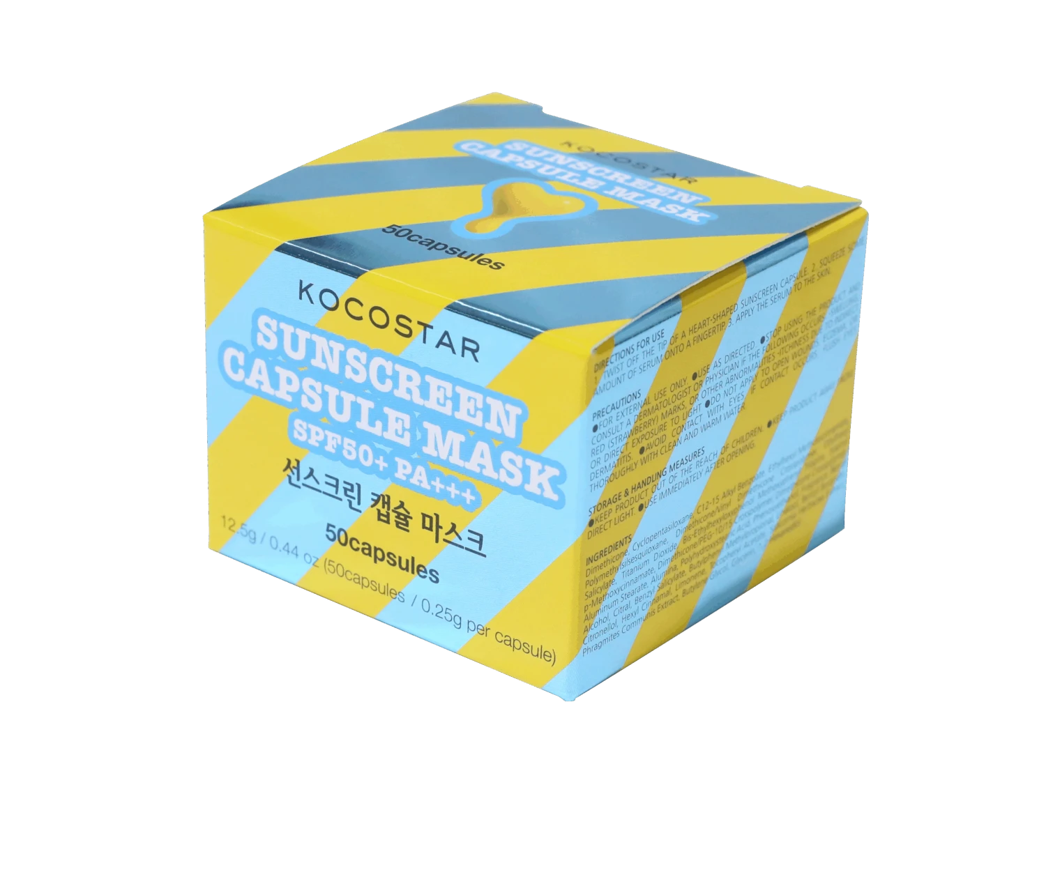 KOCOSTAR SUNSCREEN CAPSULE MASK is a Yellow Heart-Shaped capsule infused with a mix of Sunscreen Serum and UV ray absorbing oil. Since KOCOSTAR Sunscreen Capsule Mask is a hybrid, it applies smoothly and absorbs quickly to block UV rays immediately.